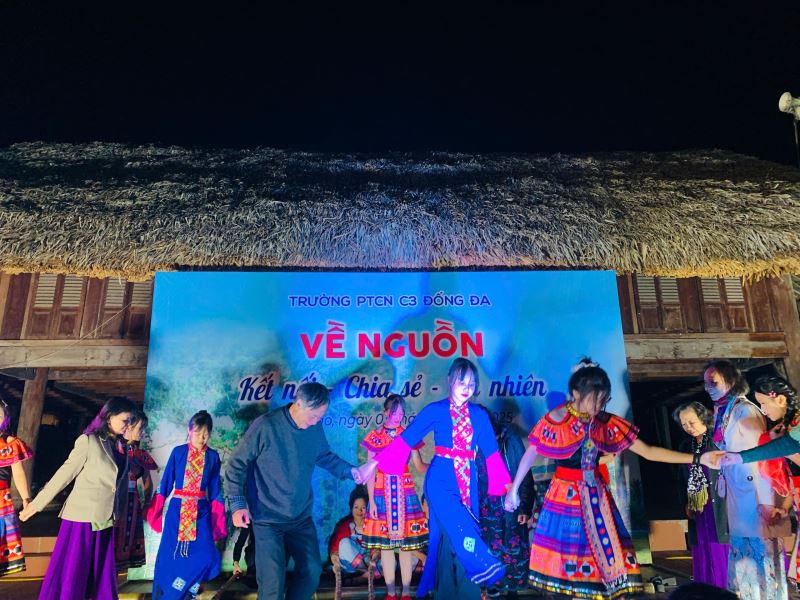 Khi hoàng hôn buông xuống, đêm giao lưu văn nghệ và lửa trại được thắp sáng giữa không gian núi rừng. Những giai điệu thân quen, những điệu múa truyền thống của đồng bào địa phương, tiếng hát, tiếng cười vang vọng giữa đại ngàn – tất cả hoà quyện thành một bản hoà âm của ký ức và niềm vui. Những cựu học sinh C3 Đống Đa năm nào nay lại cùng nhau nắm tay, cùng hát, cùng cười, như trở lại tuổi thanh xuân tươi đẹp – giản dị, chân thành và đầy năng lượng.