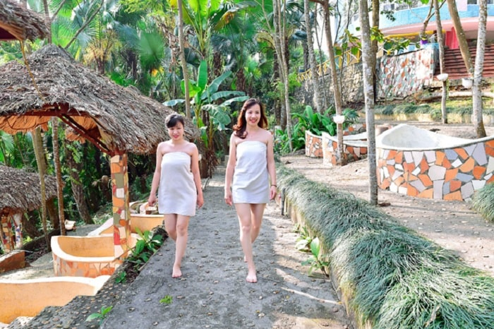 Đoàn di chuyển về khu trải nghiệm tắm khoáng ngâm mình trong bồn nước khoáng nóng thư giãn cơ thể, nguồn nước khoáng nguyên chất rất tốt cho sức khoẻ và xương khớp.