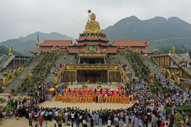 => Tòa Tam Bảo gồm 3 tầng: Tầng giảng đường, tầng thiền đường và sân lễ lộ thiên. Phía trên sân lễ là tòa tháp 3 tầng.